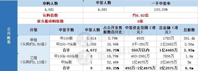 其中,公开配售申购人数4681人,一手中签率100%,认购倍数约0.82倍。