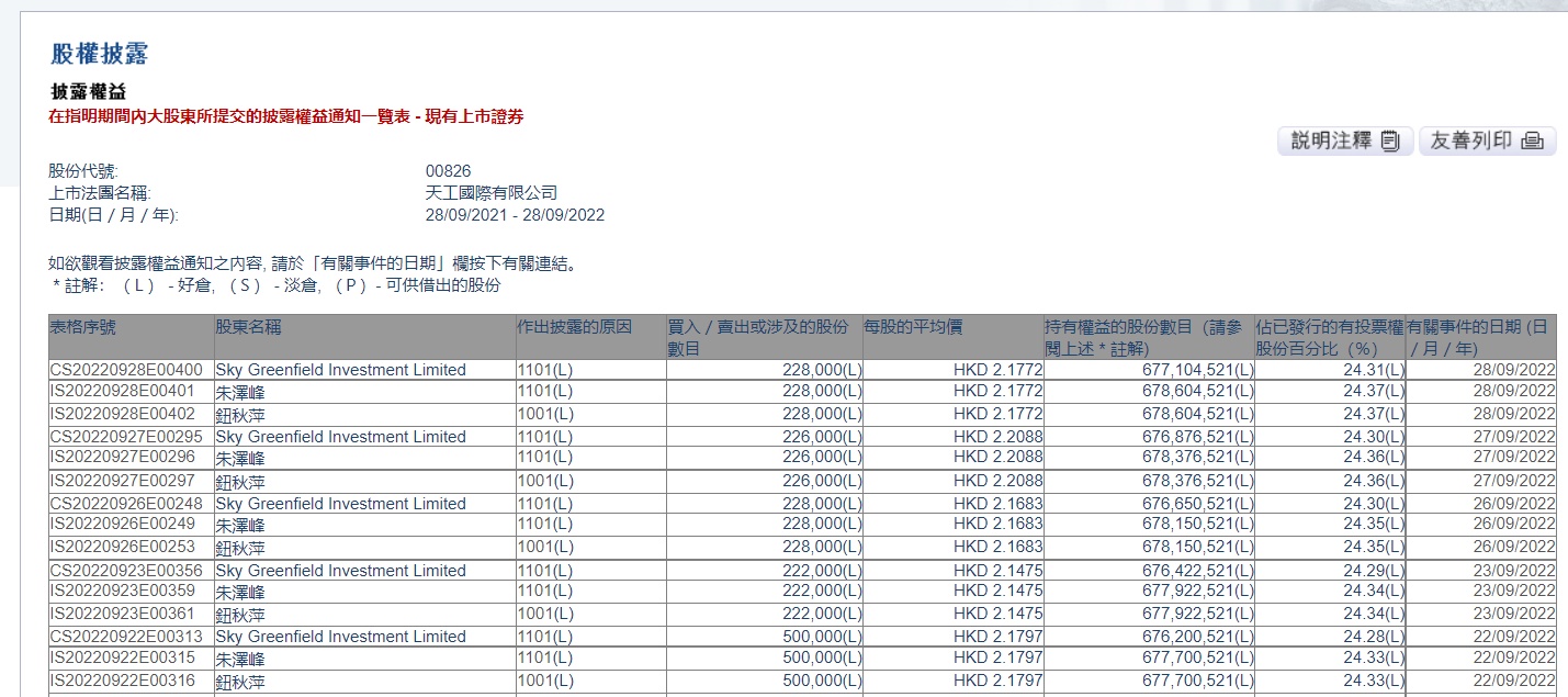智通财经APP获悉,香港联交所最新资料显示,9月27、28日,天工国际(00826)CEO朱泽峰通过其名下公司Sky Greenfield Investment Limited分别增持公司22.6万股、22.8万股,每股作价分别为2.2088港元、2.1772港元,总金额约为99.56万港元。增持后最新持股数目约为6.79亿股,最新持股比例为24.37%。公司自22日已连续5日增持,合计140.4万股,总金额约为305.65万港元。