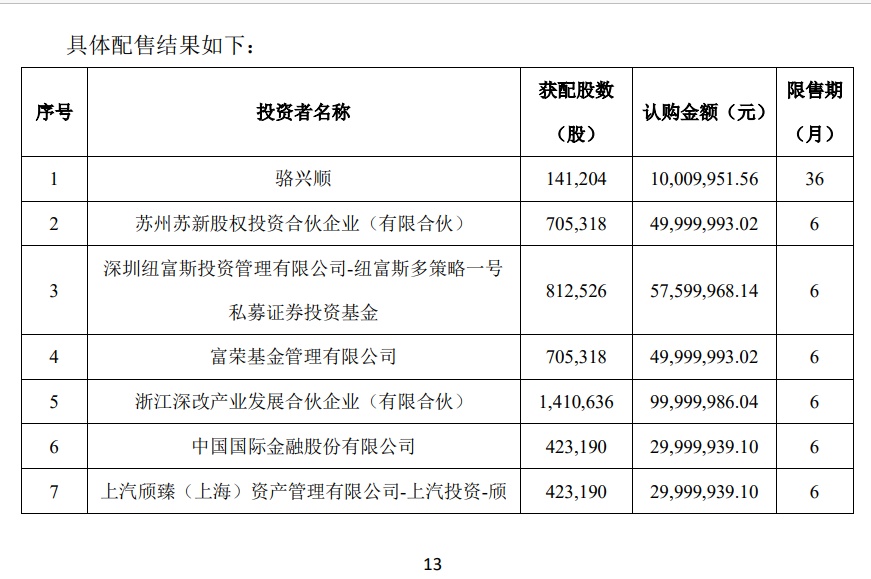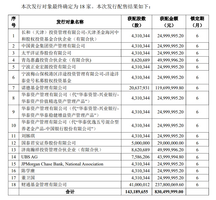 其中,财通基金获配约4100万股,认购近2.38亿元;诺德基金获配2063.79万股,获配金额1.20亿元。此外,华泰资管、UBS AG、JPMorgan、国泰君安证券、太平洋证券等机构同时参投。