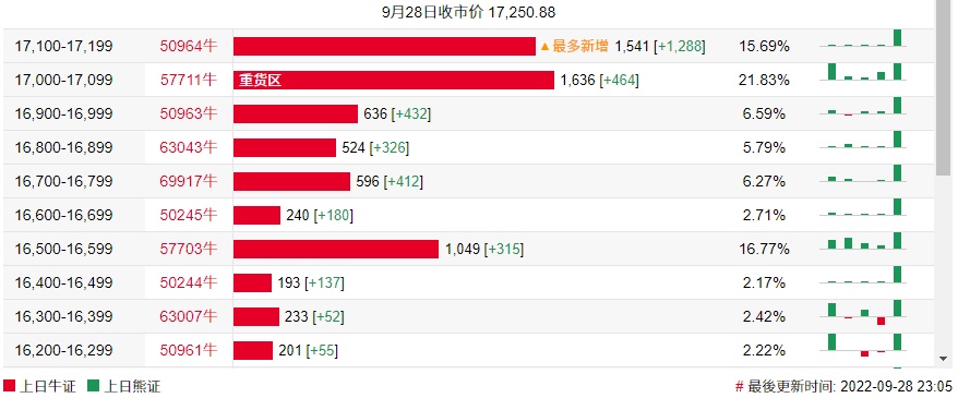 牛证街货重货区在17000-17099区间,该区间最新牛证数量为1636张,较上一交易日增加464张;最多新增在17100-17199区间,该区间最新牛证数量为1541张,较上一交易日增加1288张。