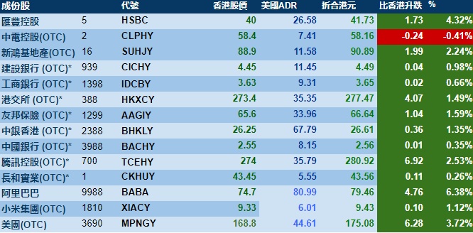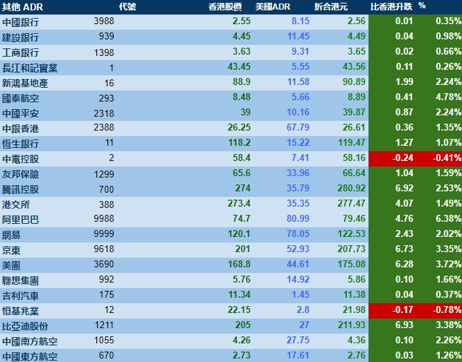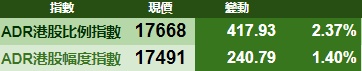 智通财经APP获悉,周三美股三大指数集体大涨,港股ADR指数上涨,按比例计算,收报17668点,较香港收市涨417.93点或2.37%。