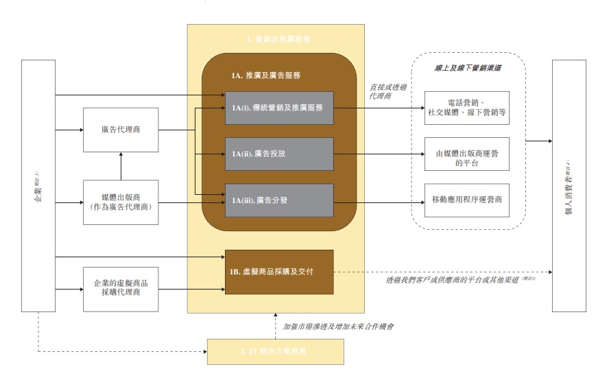 在业务模式上,于往绩记录期内,公司经营营销及推广服务和IT解决方案服务两大业务板块。其中,营销及推广服务构成公司核心业务板块,于整个往绩记录期贡献超过70.0%的收益,公司主要作为中间营销服务提供商,协助企业广告商向个人消费者提供其营销及推广活动。而作为中间广告服务提供商,公司主要通过整合广告出版商的媒体资源及对接广告商及广告出版商提升广告服务供应链价值,使广告商能够以更具成本效益的方式进行营销活动。