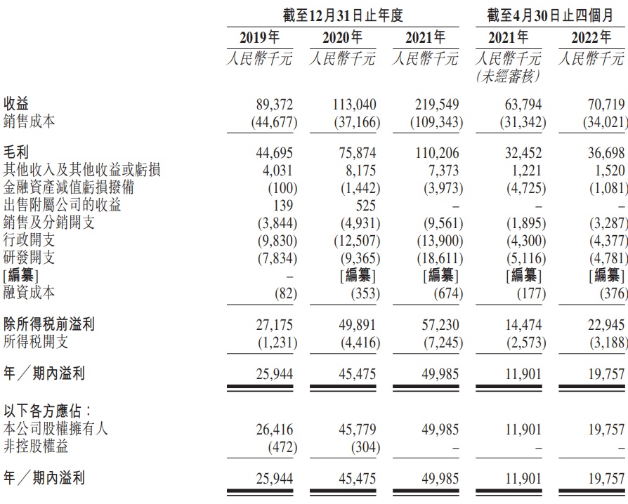 财务方面,公司于2019年、2020年、2021年及2022年前四个月收益分别约为人民币8937.2万元、1.13亿元、2.2亿元及7071.9万元。