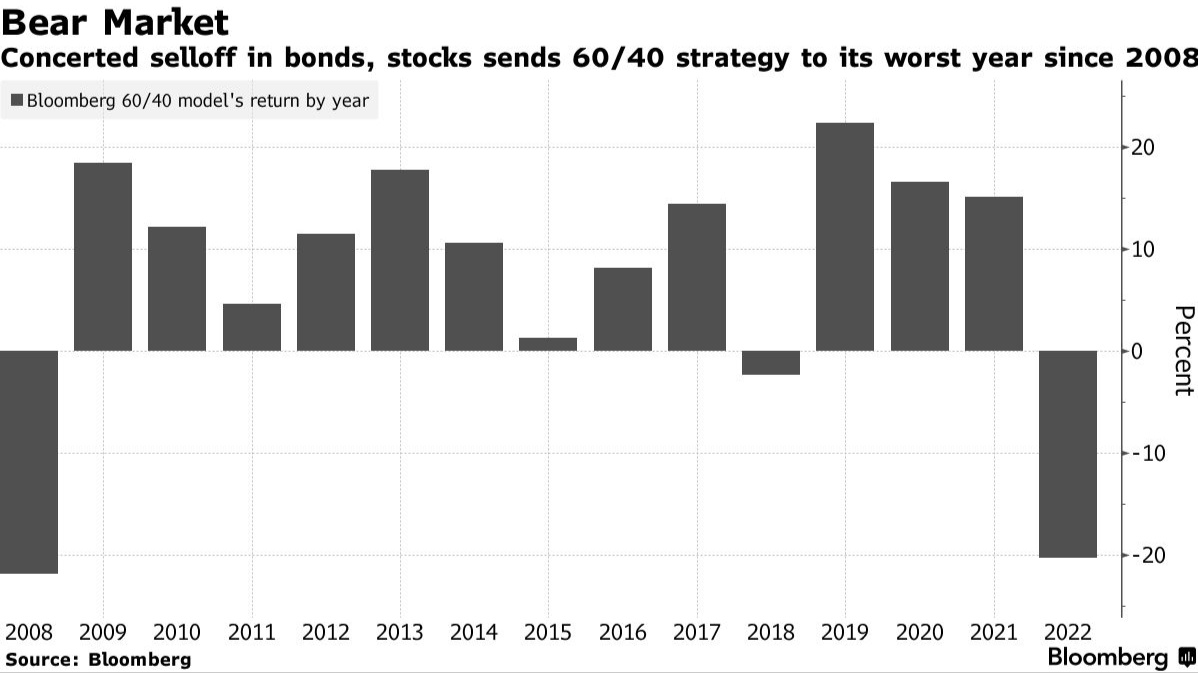 因此,防守位置为周三这样的反弹奠定了基础。然而,在整个2022年,逢低买入被证明是一种徒劳的策略,债市和股市的每一次反弹随后都遭到挫败。事实上,彭博社一个跟踪60%股票和40%固定收益证券的投资组合的模型下跌了20%,正走向2008年金融危机以来最糟糕的一年。