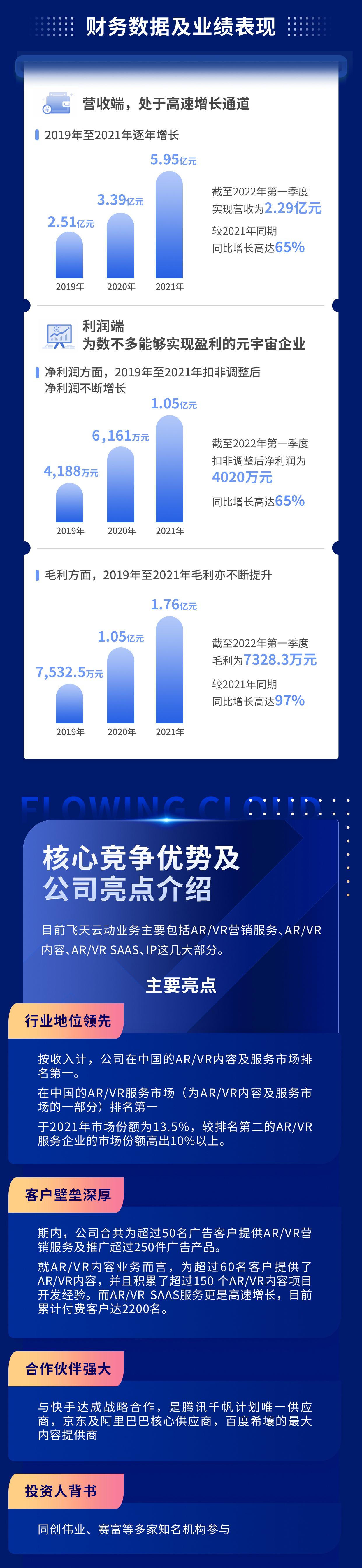 除了在市场建立一定知名度之外,凭借此前积累的技术优势和客户资源,飞天云动还是目前为数不多可以实现盈利的元宇宙概念企业——2021年扣非调整后净利润为1.05亿元,2022年Q1录得净利润为4020万元。