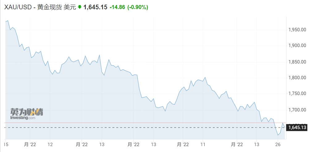数据显示,截至发稿,现货黄金下跌0.90%,至1645.15美元/盎司。彭博美元现货指数上涨0.4%,此前一个交易日下跌1%。