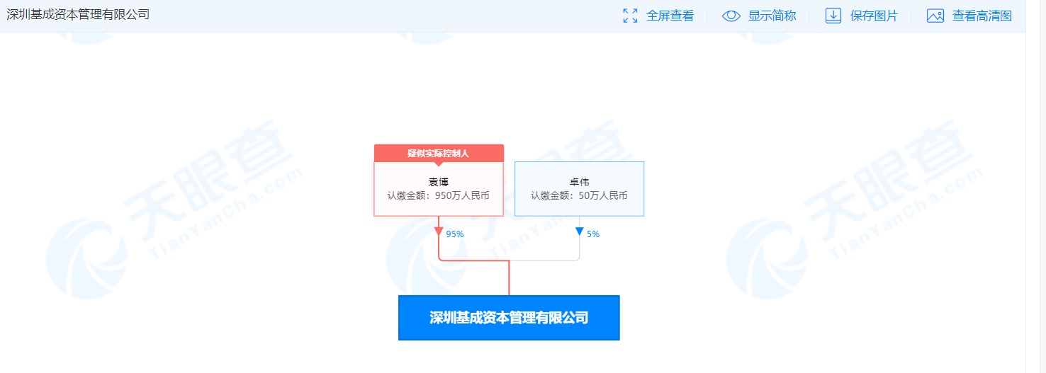 天眼查APP数据显示,基成资本成立于2013年,是一家以从事商务服务业为主的企业。从股权结构来看,袁博持有基成资本95%股权,为第一大股东,另一大股东为卓伟,持有5%股权。