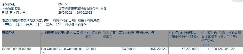 智通财经APP获悉,香港联交所最新资料显示,9月26日,The Capital Group Companies Inc.(美国资本集团)减持福莱特玻璃(06865)90.30万股,每股作价20.0230港元,总金额为1808.0769万港元。减持后最新持股数目约为5320万股,最新持股比例为11.82%。