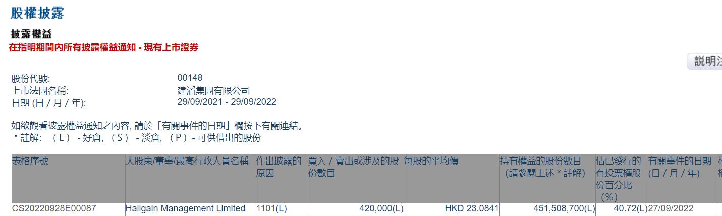 智通财经APP获悉,香港联交所最新资料显示,9月27日,Hallgain Management Limited增持建滔集团(00148)42万股,每股作价23.0841港元,总金额约为969.53万港元。增持后最新持股数目约为4.52亿股,最新持股比例为40.72%。