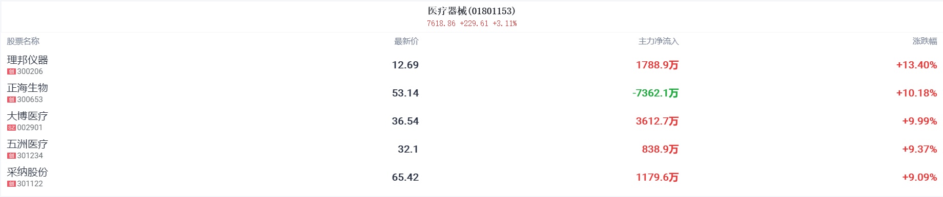 医药医疗器械股延续强势,大博医疗3连板,澳华内镜、正海生物、祥生医疗涨超10%,南微医学、睿昂基因等多股涨超8%。