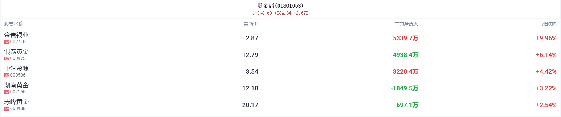 黄金概念股开盘拉升,金贵银业涨停,银泰黄金涨超6%,赤峰黄金、中润资源、湖南黄金、西部黄金、中金黄金等跟涨。