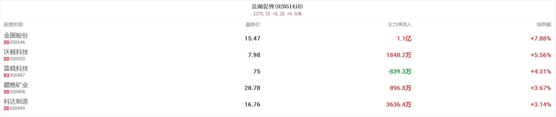 锂矿股震荡反弹,金圆股份早盘一度涨停,融捷股份涨超6%,盛新锂能、赣锋锂业、中矿资源、江特电机、西藏矿业、天齐锂业等跟涨。