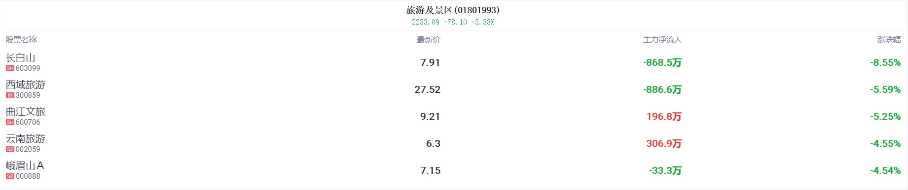旅游、酒店、航空机场等行业概念集体走弱,跌幅居前,华天酒店午后触及跌停,长白山跌超8%,金陵饭店、西安旅游、岭南控股等跌超5%,桂林旅游、西域旅游、三特索道跌超4%。
