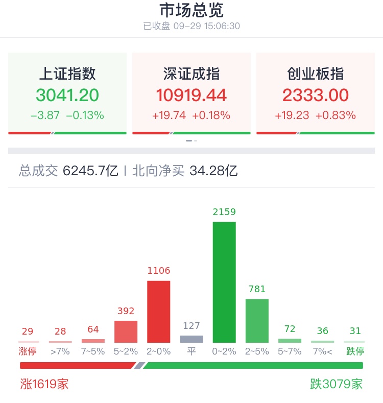 总体看,两市个股跌多涨少,市场成交继续缩量,全天成交额仅6200亿,创23个月新低。北向资金方面,全天净买入超30亿。