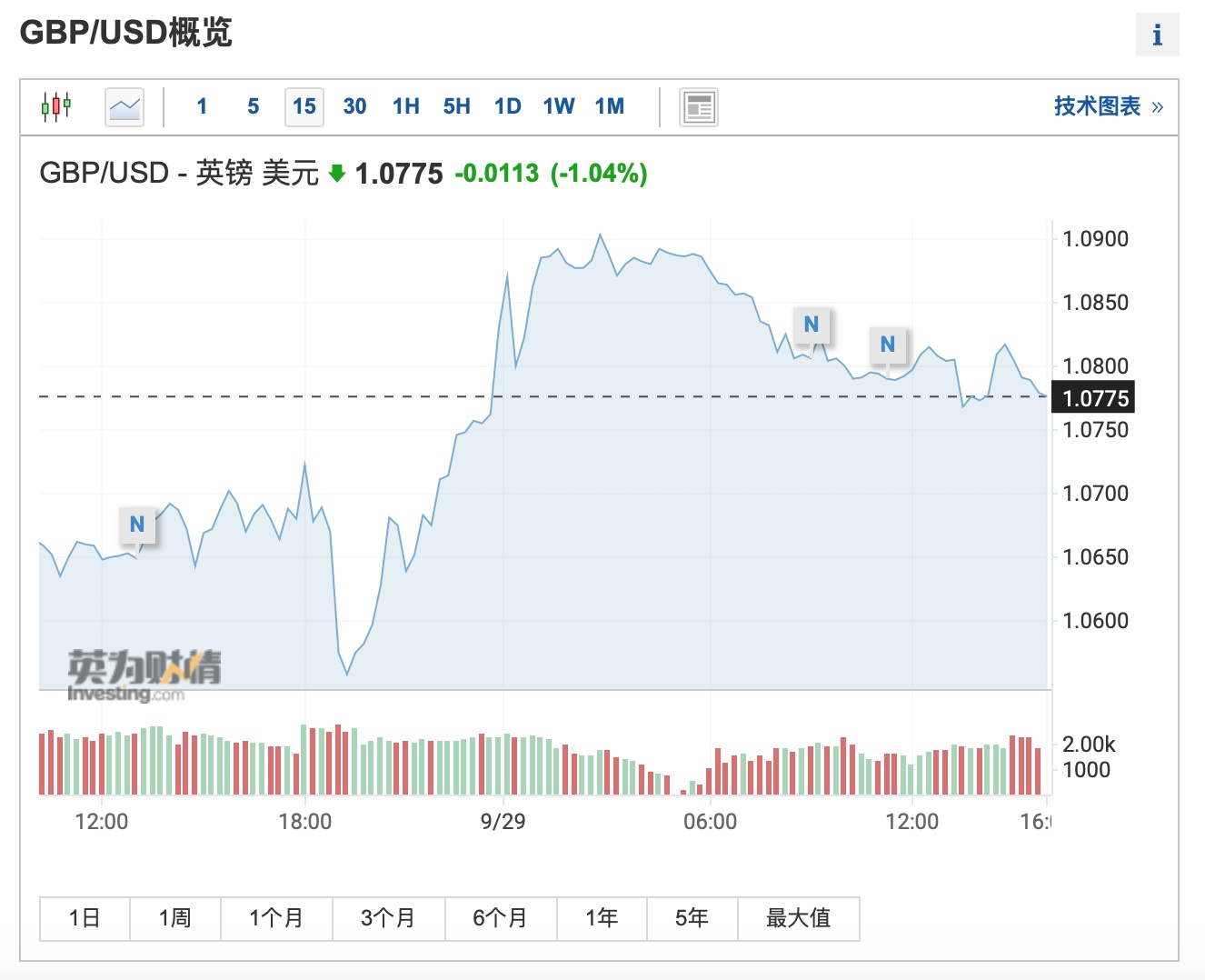 截至发稿,英镑兑美元汇率跌1.04%,报1.0775。