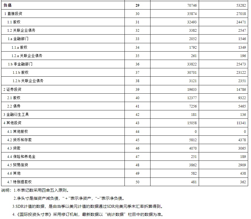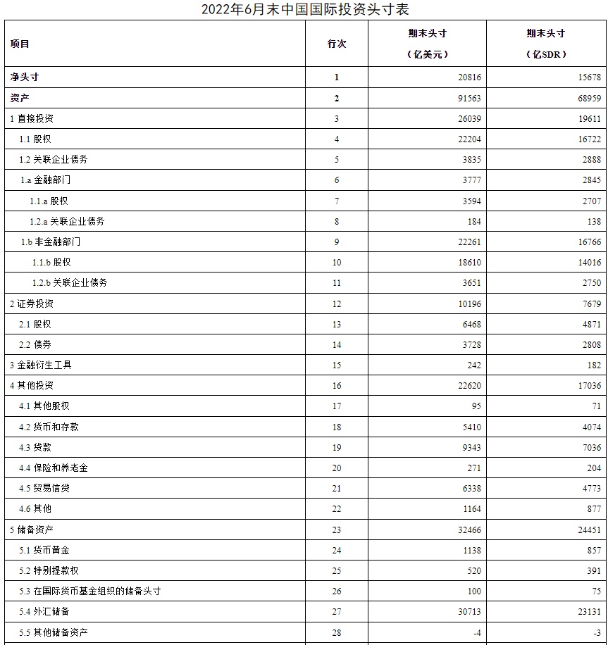 国家外汇管理局公布2022年6月末我国国际投资头寸表