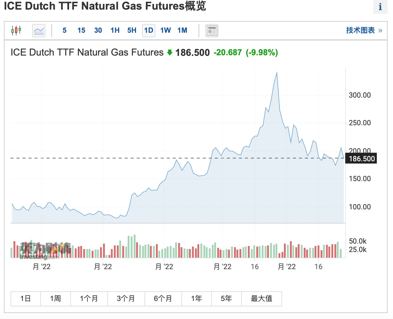 受该消息影响,欧洲天然气价格应声下跌。截至发稿基准荷兰TTF天然气期货价格跌近10%,报186.5欧元/兆瓦时。