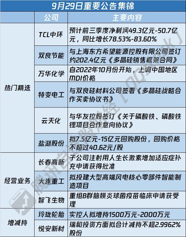 今日晚间《公告精选》的主要内容有:①TCL中环前三季净利同比预增78%-83%;②双良节能签订约656.9亿元多晶硅料采购合同;③万华化学上调10月份中国地区MDI价格;④特变电工签署约402亿元多晶硅销售合同。