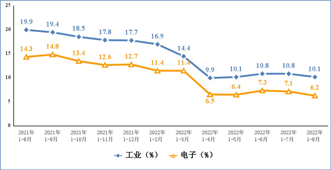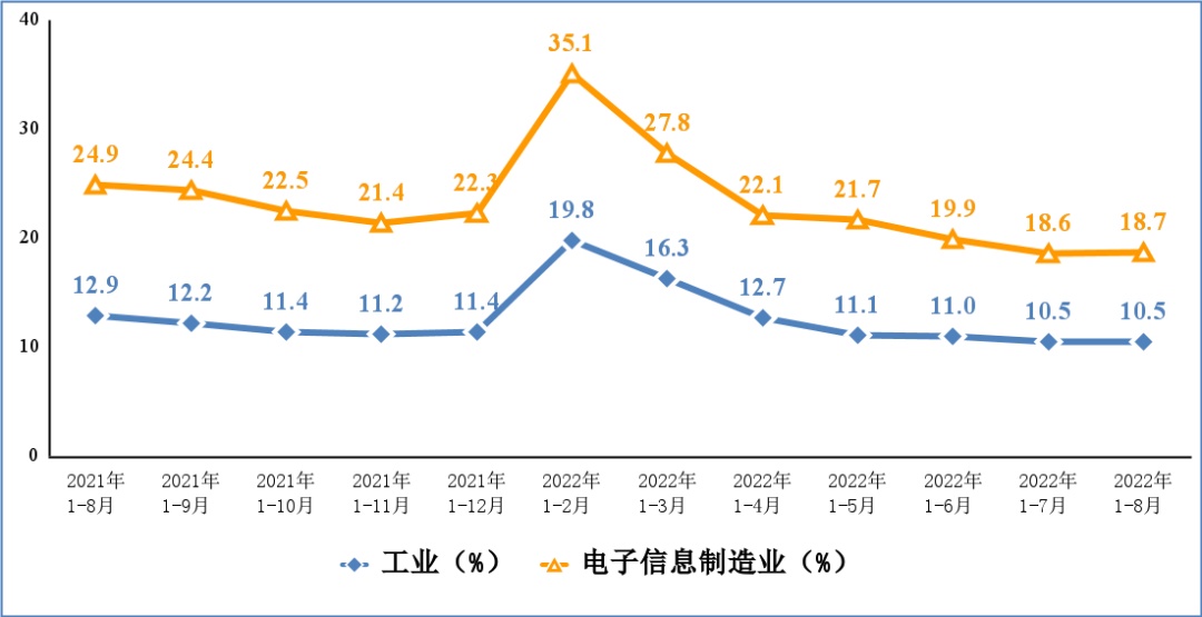 智通财经APP获悉,9月29日,工信部发布2022年1—8月份电子信息制造业运行情况。1—8月份,我国电子信息制造业生产稳步增长,出口规模持续扩大,企业营收不断提升,投资保持快速增长。1—8月份,规模以上电子信息制造业增加值同比增长9.3%,增速分别超出工业、高技术制造业5.7和0.9个百分点。8月份,规模以上电子信息制造业增加值同比增长5.5%,较7月份回落1.8个百分点;规模以上电子信息制造业实现出口交货值同比增长1%,增速比7月份回落2.6个百分点。