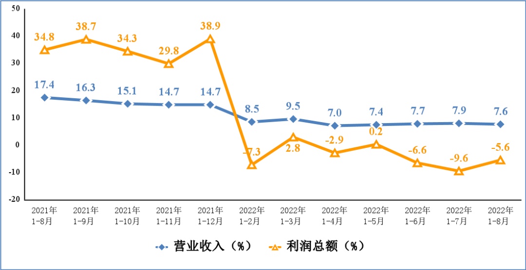 1—8月份,规模以上电子信息制造业实现营业收入95248亿元,同比增长7.6%,较1—7月份回落0.3个百分点;营业成本82987亿元,同比增长8.8%;实现利润总额4499亿元,同比下降5.6%,较1—7月份降幅收窄4个百分点;营业收入利润率为4.7%。
