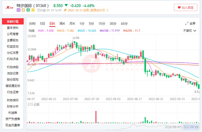 值得一提的是,自2022年7月创下14.98港元的年内高位之后,特步中国的股价就开始反复下行。截至2022年9月29日收盘,特步国际股价报收于8.55港元,较年内高位跌去超40%,市值蒸发超160亿港元。
