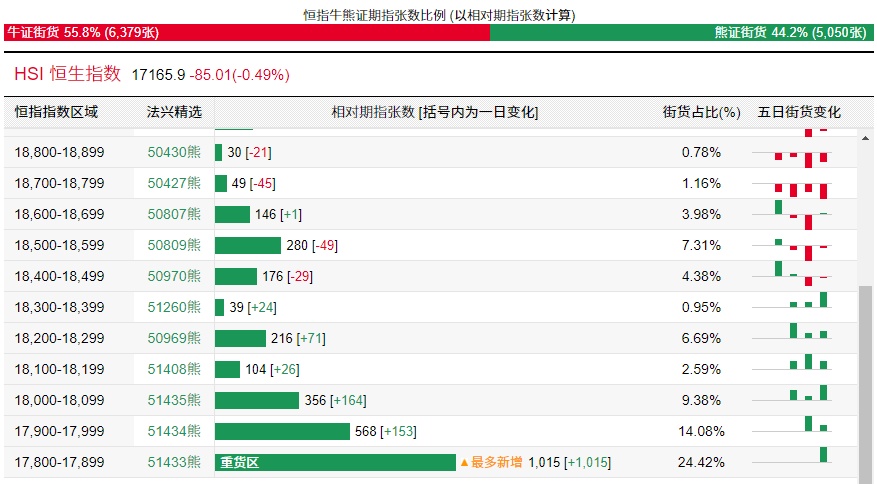 法兴恒指牛熊证街货分布图中的数据显示,熊证街货重货区在17800-17899区间,该区间最新熊证数量为1015张,较上一交易日增加1015张;最多新增在同一区间。