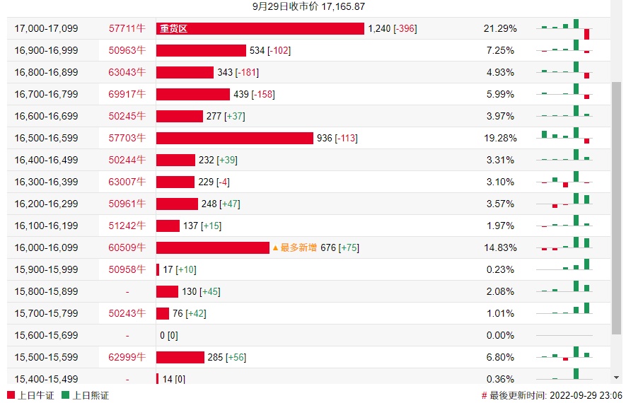 牛证街货重货区在17000-17099区间,该区间最新牛证数量为1240张,较上一交易日减少396张;最多新增在16000-16099区间,该区间最新牛证数量为676张,较上一交易日增加75张。