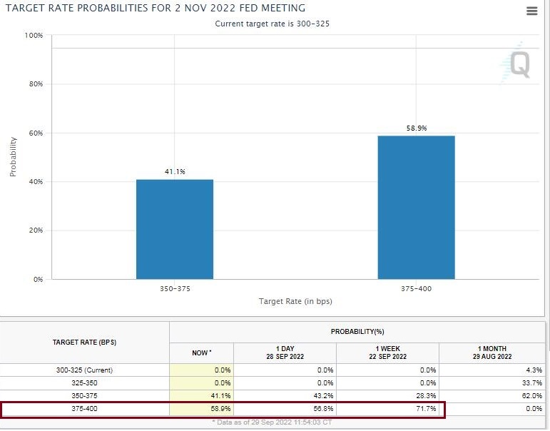 到本周四美股盘中,芝商所(CME)的“美联储观察工具”显示,美国联邦基金利率期货交易市场预计,11月美联储加息75个基点的几率接近59%,加息50个基点的几率约为41%,一周前预计加息75基点的几率超过70%、预计加息50基点的几率约为28%。