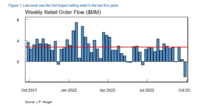 在经历了疫情后的多次分歧后,华尔街和普通民众如今纷纷抛售股票,这是今年毁灭性熊市造成损失的最新迹象。摩根大通根据交易所公开数据估计,截至周二的一周,散户合计抛售了29亿美元的股票,这是他们在6月中旬市场低谷时卖出股票数量的四倍多,也是过去五年来第二大周抛售量。