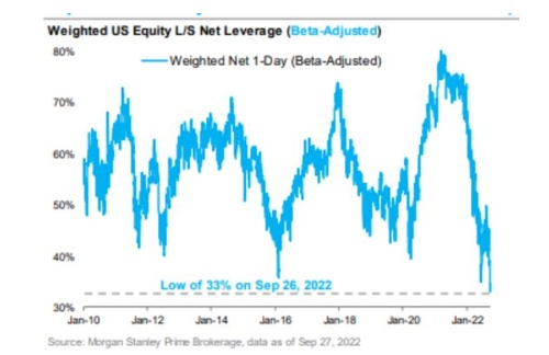最后,即使是过往通常持有怀疑态度的对冲基金也变得愈加悲观。数据显示,对冲基金继续削减风险敞口,净杠杆率(一种衡量对冲基金多头与空头头寸的风险偏好的指标)本周降至摩根士丹利机构经纪商自2010年初开始跟踪数据以来的最低水平。