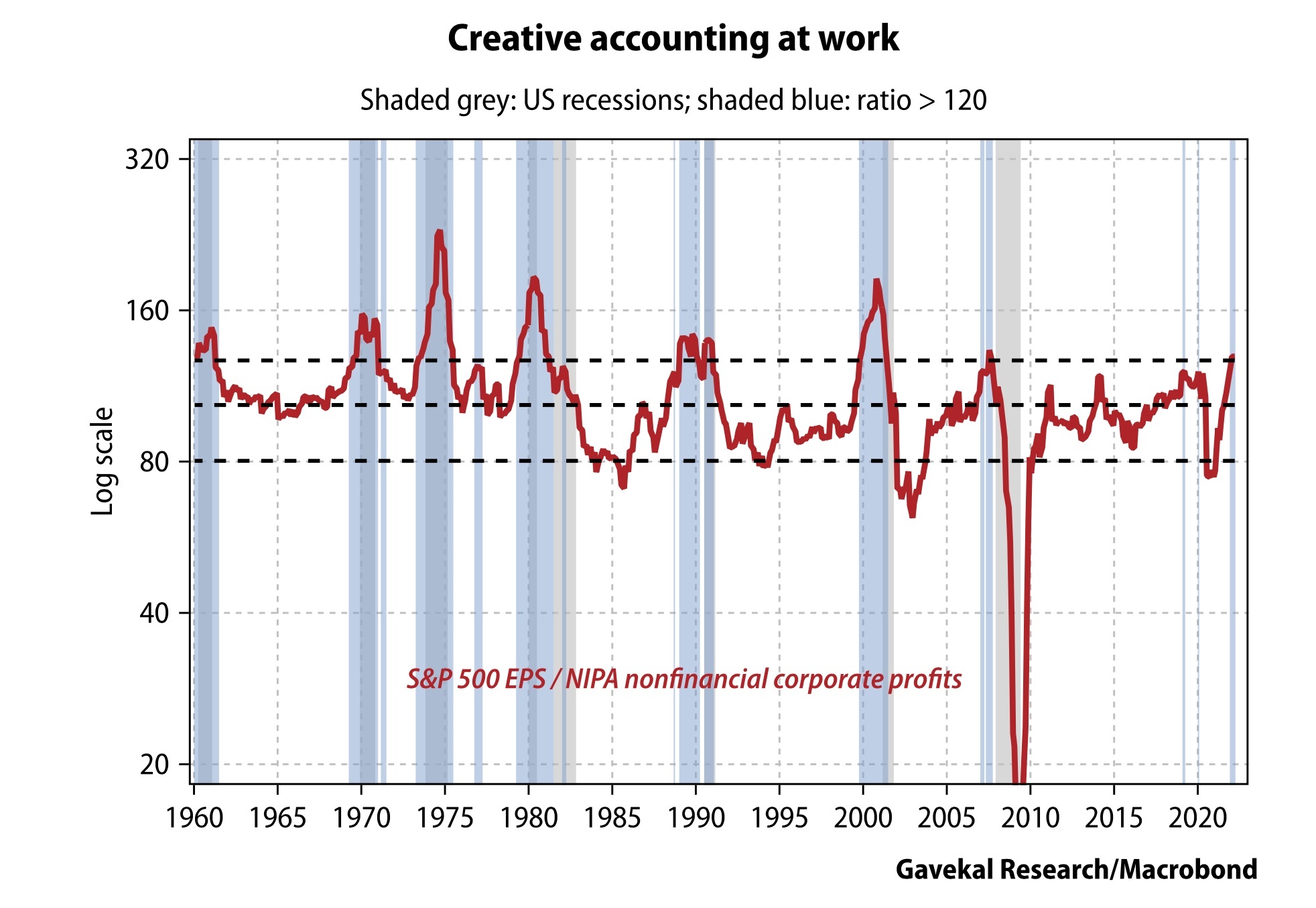 智通财经APP了解到,投研机构Gavekal Research的分析师Charles Gave认为,或许是一些“创造性的会计方法”在起作用。Gave将标普500公司的利润与整体经济的利润(NIPA)进行了比较,从历史数据看,这两个系列数据在经济衰退的边缘出现了明显分歧。