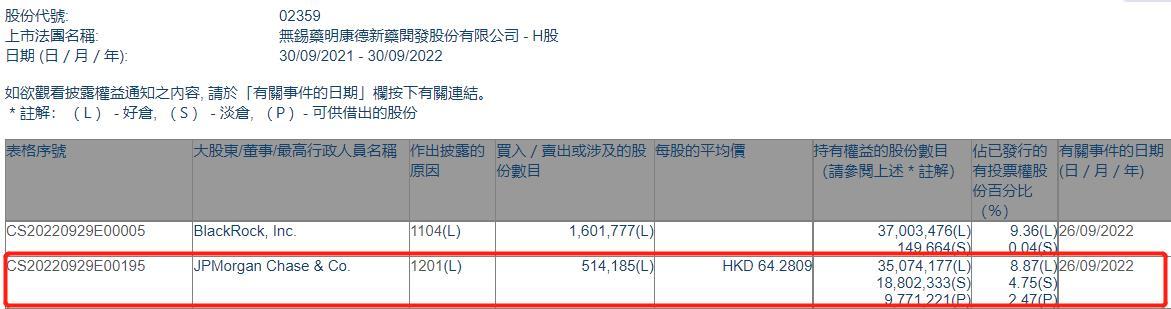 智通财经APP获悉,香港联交所最新资料显示,9月26日,小摩减持药明康德(02359)51.4185万股,每股作价64.2809港元,总金额约为3305.23万港元。减持后最新持股数目为3507.42万股,最新持股比例为8.87%。