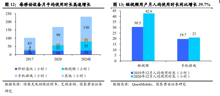 一方面,就需求来看,艾瑞咨询数据显示,2017-2020年每移动设备月平均使用时长由101小时增至168小时,对应CAGR(复合年均增长率)为18.3%,预计未来将以8.4%的CAGR增至2024年的231小时;分应用来看,2020年短视频/手机游戏月平均使用时长分别为33/12小时,2017-2020年CAGR分别为76.5%/10.1%,预计2020-2024年CAGR分别为18.6%/20.5%。