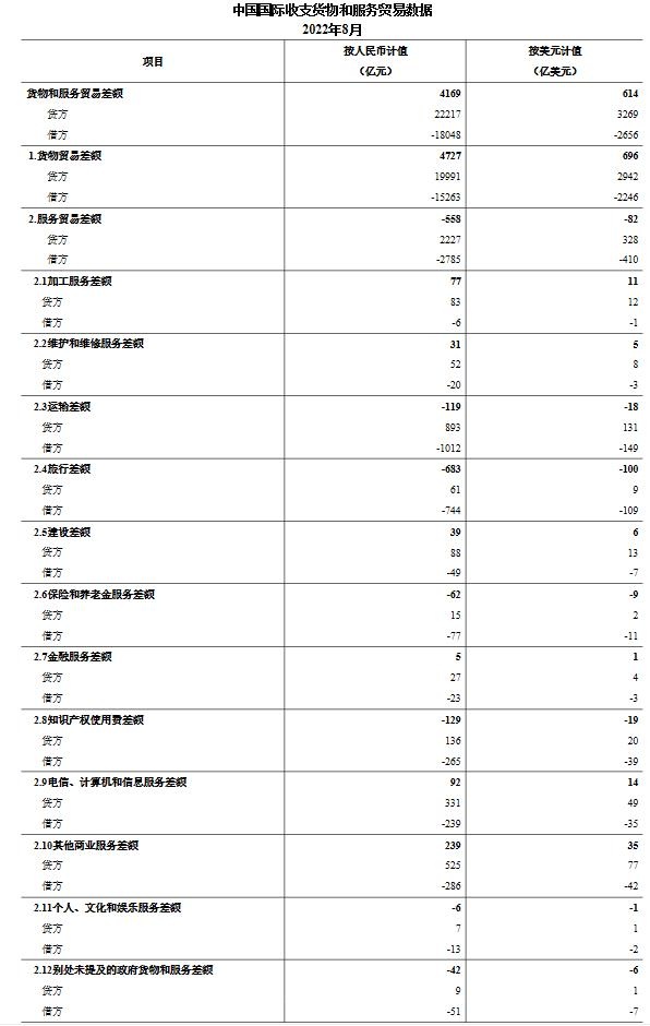 智通财经APPP获悉,9月30日,国家外汇管理局公布2022年8月我国国际收支货物和服务贸易数据2022年8月,我国国际收支货物和服务贸易进出口规模40265亿元,同比增长9%。其中,货物贸易出口19991亿元,进口15263亿元,顺差4727亿元;服务贸易出口2227亿元,进口2785亿元,逆差558亿元。服务贸易主要项目为:运输服务进出口规模1905亿元,其他商业服务进出口规模811亿元,旅行服务进出口规模804亿元,电信、计算机和信息服务进出口规模571亿元。按美元计值,2022年8月,我国国际收支货物和服务贸易出口3269亿美元,进口2656亿美元,顺差614亿美元。
