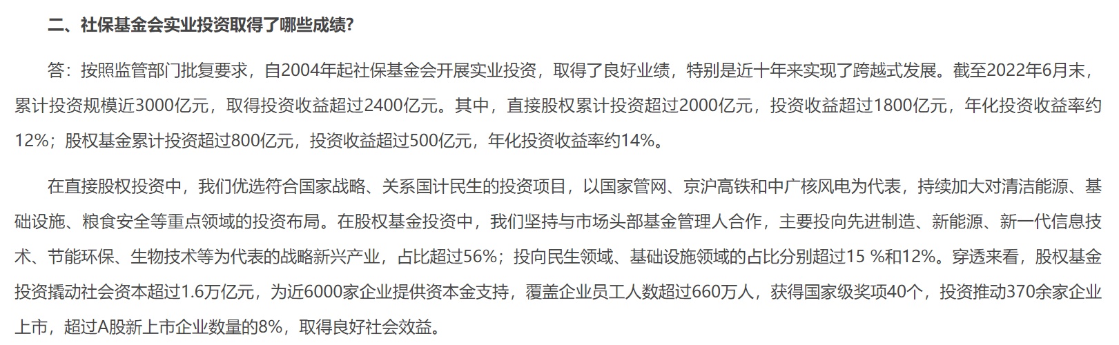 数据显示,过去近十年间,社保基金会实业投资取得成绩显著,截至2022年6月末,累计投资规模近3000亿元,取得投资收益超过2400亿元。其中,直接股权投资中,优选符合国家战略、关系国计民生的投资项目,以国家管网、京沪高铁和中广核风电为代表,持续加大对清洁能源、基础设施、粮食安全等重点领域的投资布局。直接股权累计投资超过2000亿元,投资收益超过1800亿元,年化投资收益率约12%。