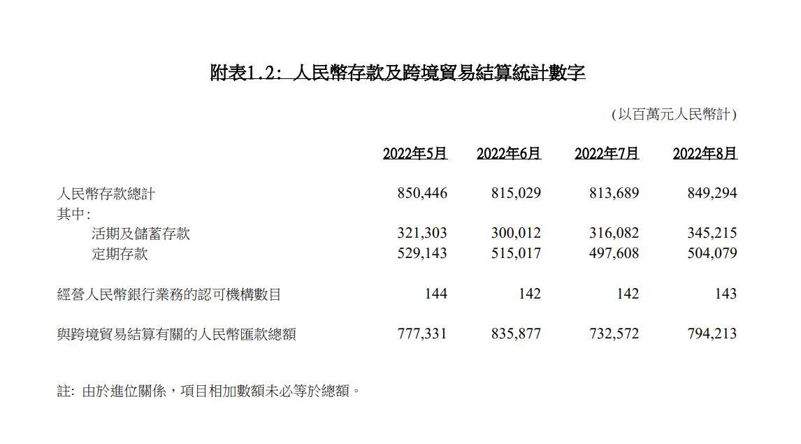 2022年8月份认可机构的存款总额没有明显变动。其中港元存款下跌0.9%,外币存款则上升0.9%,主要反映企业资金流动。由年初截至8月底计,存款总额及港元存款均上升0.6%。香港人民币存款在8月份上升4.4%,于8月底为8493亿元人民币。跨境贸易结算的人民币匯款总额于8月份为7942亿元人民币,而7月份为7326亿元人民币。存款变动受多项因素影响,包括利率走势、市场集资活动等,因此适宜观察较长期趋势,毋须过度解读个别月份的波动。