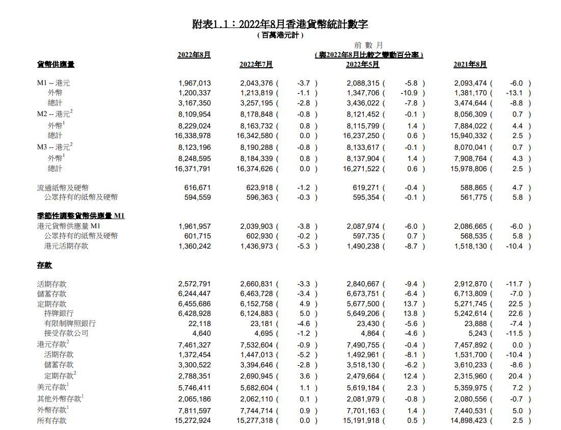 智通财经APP获悉,9月30日,香港金融管理局发表的统计数字显示,8月份港元货币供应量M2及M3同时下跌0.8%,与去年同期比较则均上升0.7%。8月份经季节因素调整的港元货币供应量M1下跌3.8%,与去年同期比较下跌6.0%,部分反映投资相关活动。货币供应量总额M2及M3于8月份均没有明显变动,与去年同期比较,M2及M3均上升2.5%。