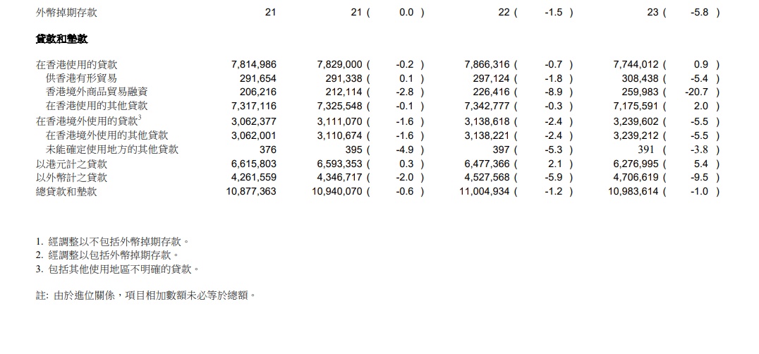 8月份贷款与垫款总额下跌0.6%,由年初截至8月底计则略跌0.2%。其中在香港使用的贷款(包括贸易融资)在8月份下跌0.2%,在香港境外使用的贷款下跌1.6%。由于港元贷款上升而港元存款下跌,港元贷存比率由7月底的87.5%,上升至8月底的88.7%。