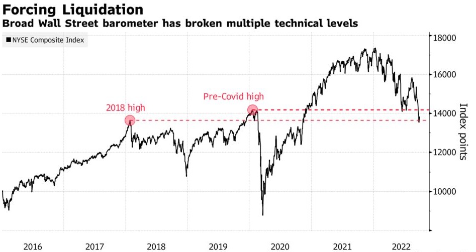 智通财经APP获悉,据美国银行策略师称,华尔街不断增加的损失现在像滚雪球一样,正变成被迫的资产清算。包括美国股票、存托凭证和房地产投资信托在内的纽交所综合指数已跌破多个技术支撑位,包括200周移动均线、14000点关口,以及2018年和2020年当时的高点。美国银行表示,现在累积的亏损可能会迫使基金出售更多资产以筹集现金,从而加速抛售。