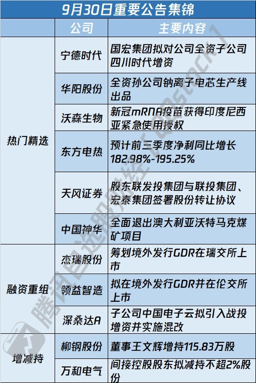 今日晚间《公告精选》的主要内容有:①矿业巨头洛阳钼业迎新股东,宁德时代将间接持股;②沃森生物新冠病毒mRNA疫苗获印尼紧急使用授权;③东方电热预计前三季度净利同比增183%-195%;④华阳股份全资孙公司钠离子电芯生产线出品。