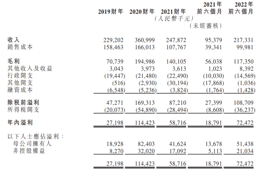 于截至2021年12月31日止三个年度及截至2022年6月30日止六个月内,该公司的收入分别约为人民币2.292亿元、人民币3.61亿元、人民币2.479亿元及人民币2.173亿元,而该公司的净利润分别约为人民币2720万元、人民币1.144亿元、人民币5870万元及人民币7250万元。