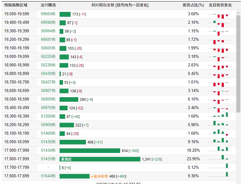 法兴恒指牛熊证街货分布图中的数据显示,熊证街货重货区在17800-17899区间,该区间最新熊证数量为1241张,较上一交易日增加226张;最多新增在在17600-17699区间,该区间最新熊证数量为460张,较上一交易日增加460张。