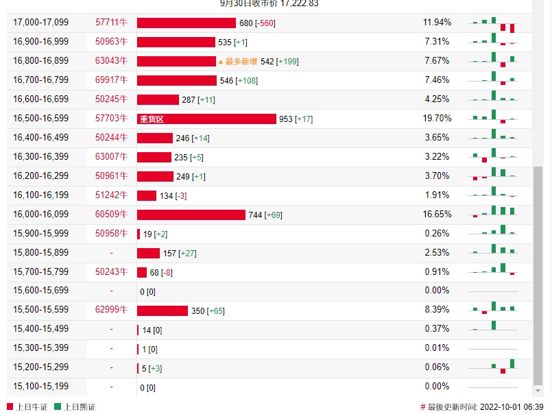 牛证街货重货区在16500-16599区间,该区间最新牛证数量为953张,较上一交易日增加17张;最多新增在16800-16899区间,该区间最新牛证数量为542张,较上一交易日增加199张。