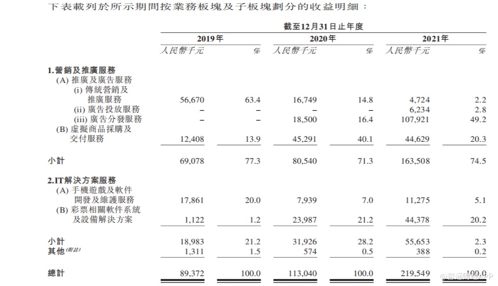 营销及推广服务包括两个业务分支:推广及广告服务和虚拟商品采购及交付服务。推广及广告服务的业务模式为,公司通过不同的服务协助企业广告商获取及/或重新激活用户,上述服务包括:传统营销及推广服务;广告投放服务及广告分发服务。虚拟商品采购及交付服务的业务模式为,就企业的用户获取、参与及/或留存,为彼等采购虚拟商品(例如电信服务充值券、数字优惠券及礼品卡)并将虚拟商品交付予彼等。