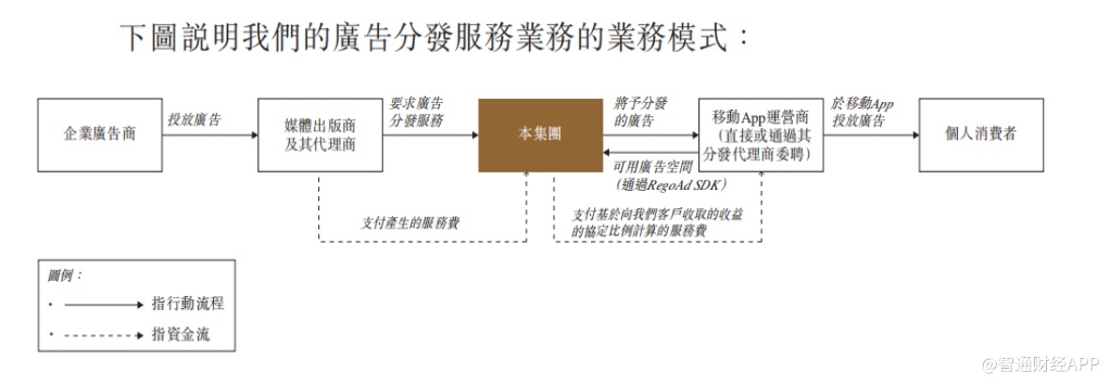 润歌互动在招股书中表示,公司向客户(即广告代理商,包括大型媒体平台运营商及其代理商)提供广告分发服务,并通过公司的RegoAd SDK将其与移动App运营商对接及与广告代理商的平台相结合,并将企业广告商的广告与移动App运营商运营的移动App中可用及适合的移动广告空间进行匹配。