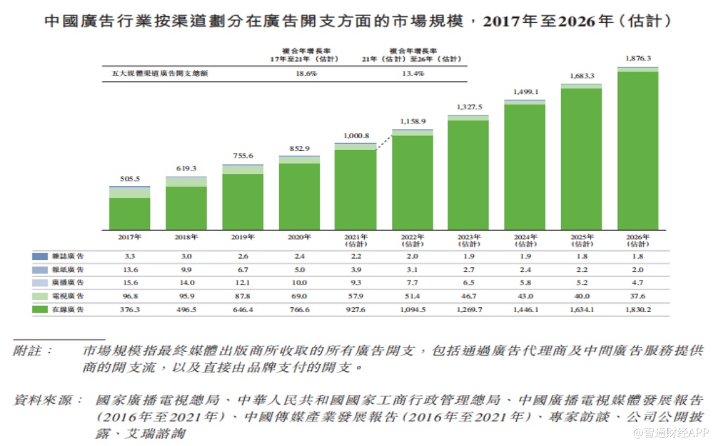 从市场角度看,艾瑞咨询报告显示, 就企业广告开支而言,中国五大主要渠道的广告总市值由2017年的人民5,055亿元增加至2021年的10,008亿元,复合年增长率为18.6%。