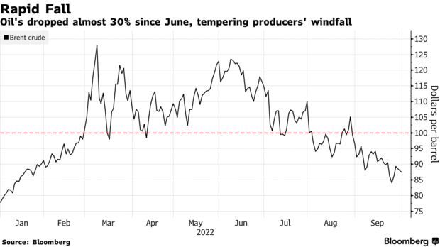 2月俄乌战争爆发后,布伦特原油飙升至每桶125美元以上,但此后震荡下行,减少了沙特阿拉伯、俄罗斯、阿拉伯联合酋长国和其他主要产油国的收入。
