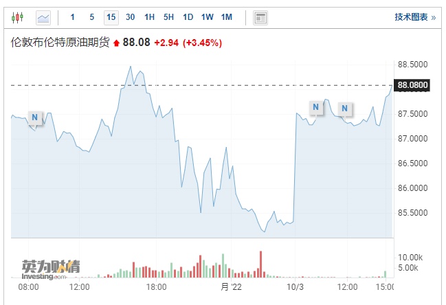 受减产消息影响,油价大幅上涨。截至发稿,布伦特原油上涨3.45%至每桶88.08美元。