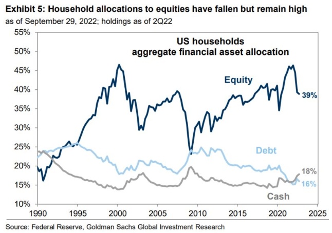 包括David J Kostin在内的高盛美国策略师在上周五的一份报告中写道,尽管对冲基金、共同基金和散户在今年的下跌中削减了股票敞口,但“从长期历史来看,投资者股票头寸仍处于高位,因此,我们预计2023年还会进一步抛售”。