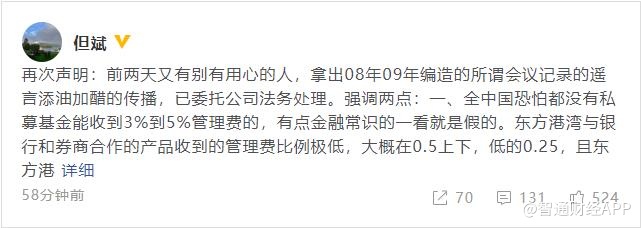 但斌在微博中写道:“前两天又有别有用心的人,拿出08年09年编造的所谓会议记录的遥言添油加醋的传播,已委托公司法务处理。”但斌强调,东方港湾与银行和券商合作的产品收到的管理费比例极低,大概在0.5上下,低的0.25,且东方港湾直营产品,从来都不收管理费。但斌还称,“自2021年2月开始,这两年东方港湾业绩没做好,都怪我自己!”